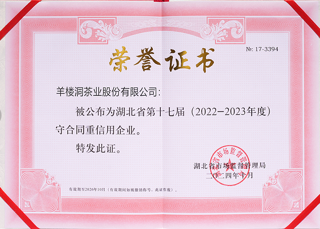 近日,湖北省市场监督管理局公布第十七届(2022—2023年度)“守合同重信用”企业,湖北茶发集团旗下羊楼洞茶业股份有限公司(以下简称公司)凭借优良的合同履约及信用状况,荣获本次省级荣誉称号。