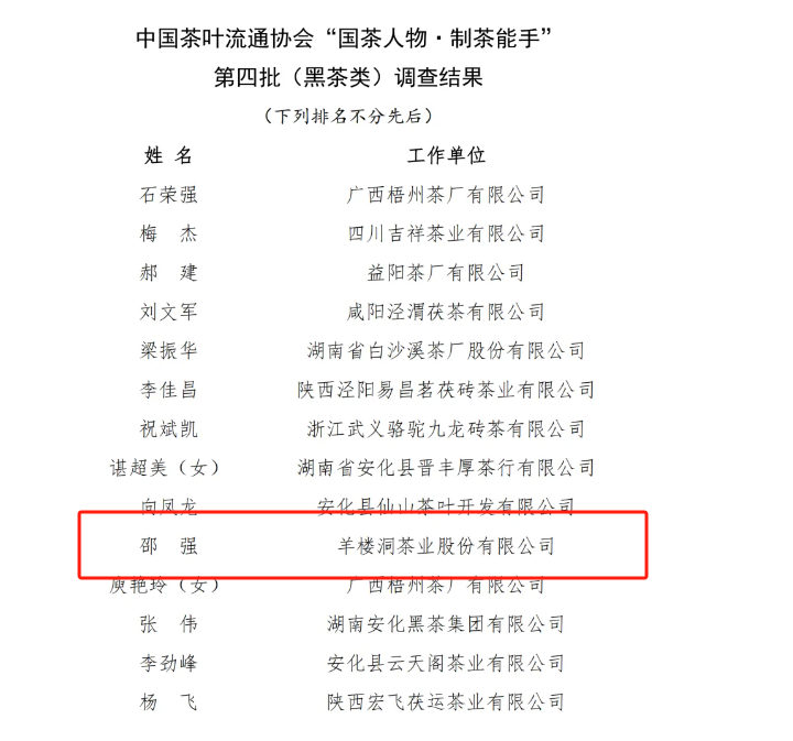 近日,中国茶叶流通协会公布了第四批(黑茶类)“国茶人物?制茶能手”调查结果,湖北茶发集团旗下羊楼洞茶业股份有限公司(以下简称公司)技术研发总监邵强上榜。