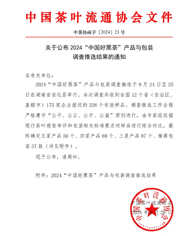 9月28日,2024中国黑茶大会茶祖节暨第六届湖南(益阳)安化黑茶文化节在安化县天下黑茶大剧院开幕。中国茶叶流通协会在会上正式发布2024年度黑茶重点产区、黑茶重点企业、黑茶类“国茶工匠·人物推选”制茶大师及制茶能手,以及“中国好黑茶”产品与包装调查推选结果。湖北茶发集团旗下羊楼洞茶业股份有限公司(以下简称公司...